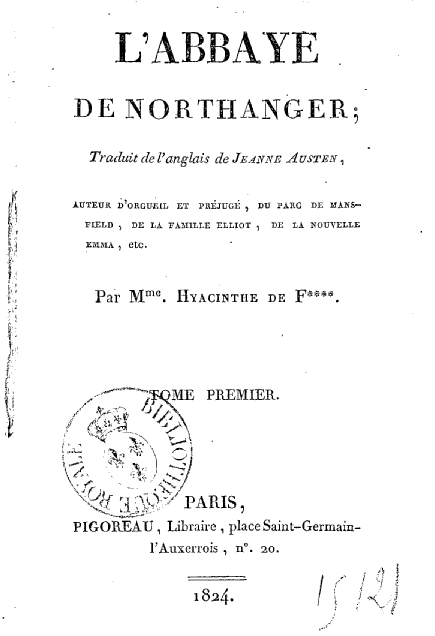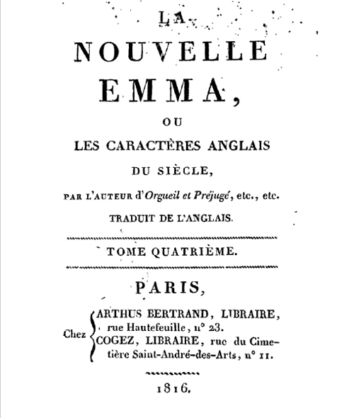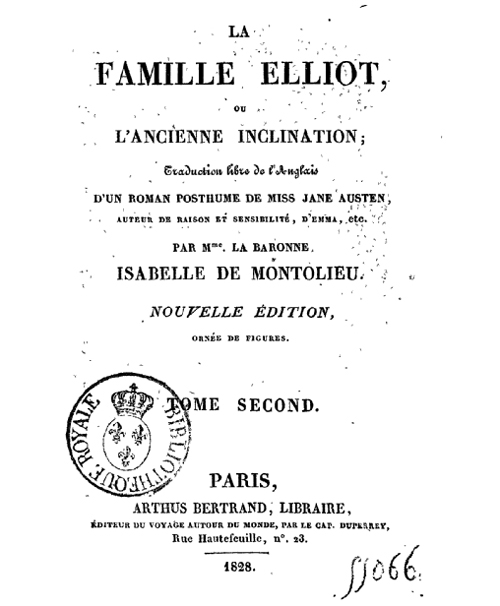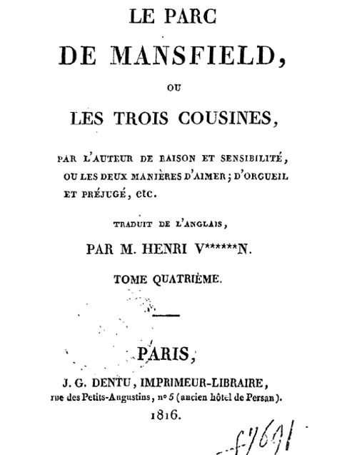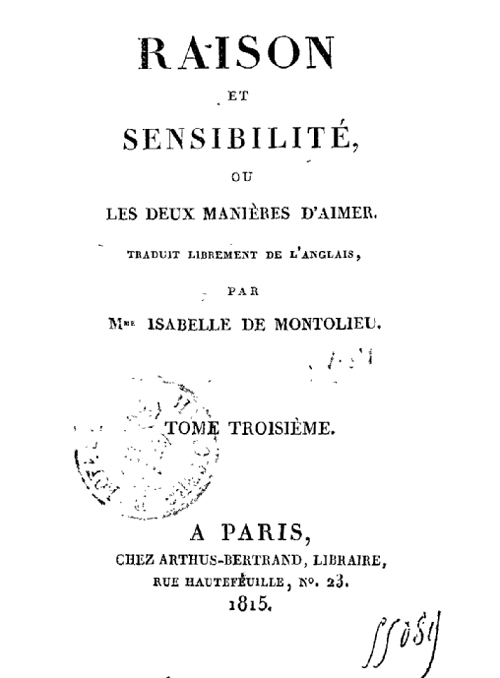 Sempre lemos que Jane Austen teve pouco reconhecimento como escritora durante a sua vida, seja pelo anonimato que ela mesma se impunha ou pela pouca divulgação de um autor novato como acontece hoje em dia também. Mas ela teve o prazer de ver seus livros traduzidos para o francês. Em 1815 apareceu* em Paris Raison et Sensibilité, ou les Deux Manîeres d’Aimer (traduit librement** par Mme. Isabelle de Montolieu). No ano seguinte foi a vez de Mansfield Park e Emma que ficaram com os títulos: Le Parc de Mansfield, ou Les Trois Cousines e La Nouvelle Emma, ou les Caractères Anglais du Siècle, o primeiro traduzido por Henri Vilmain e o segundo numa tradução anônima. Madame de Montolieu também traduziu Persuasão com o título de La Famille Elliot, ou L’Ancienne Inclination, em 1828. Reparem na graça dos subtítulos das traduções francesas!
